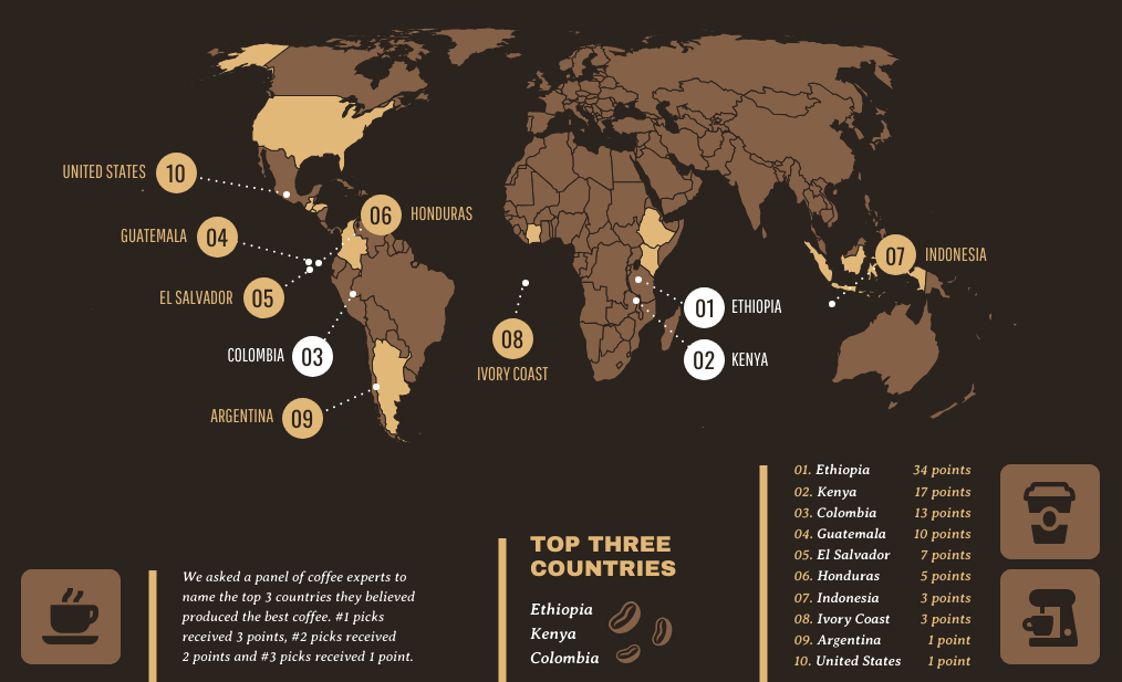 To właśnie od pochodzenia kawy, a także jakości i składu gleby, położenia plantacji, jakości powietrza, stopnia nasłonecznienia, natężenia deszczów, wysokości nad poziomem morza i wszelkich czynników środowiskowych zależy jakość owoców kawowca, a także smak kawy. Kawa, choć wywodzi się z etiopskich plantacji, w tej chwili uprawiana jest nie tylko w wielu regionach Afryki, ale także Ameryki Środkowej, Południowej oraz Azji.